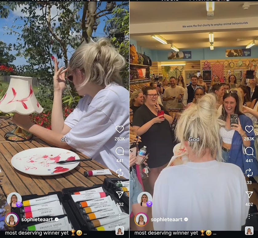 A great example of that is SophieTeaArt, the artist who started going around charity shops (thrift shops which sell stuff to raise funds for charities), buying items, painting on them, donating them back to the charity shop she buys them from, and then posts pictures and videos of them on Instagram telling people where they can find them.